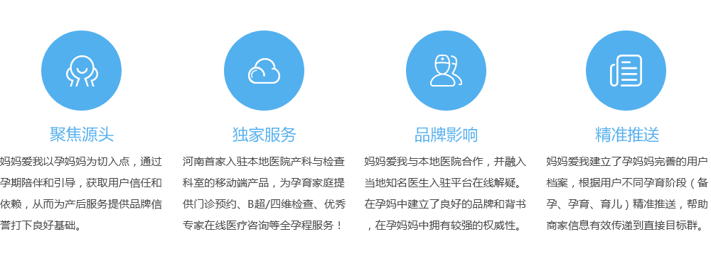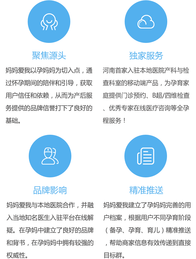 在“互联网+”的大时代背景下,作为河南首家入驻本地医院产科与检查科室的移动端产品,「妈妈爱我」APP建立河南省互联网孕产医疗服务品牌,为广大孕产家庭提供产检预约快捷就诊、医生在线咨询、全孕程指导等特色互联网平台,同时提供同城孕妈交流、实用工具、积分商城、会员福利等多元化的孕期服务。